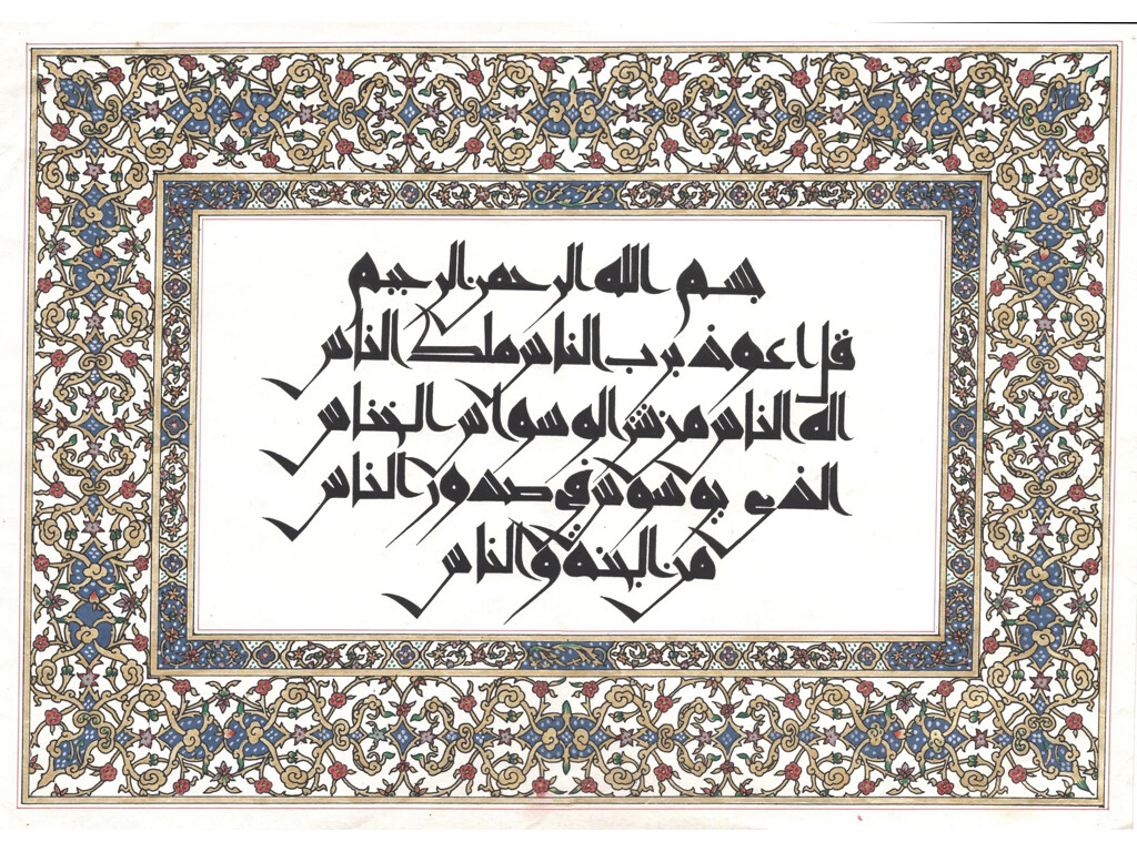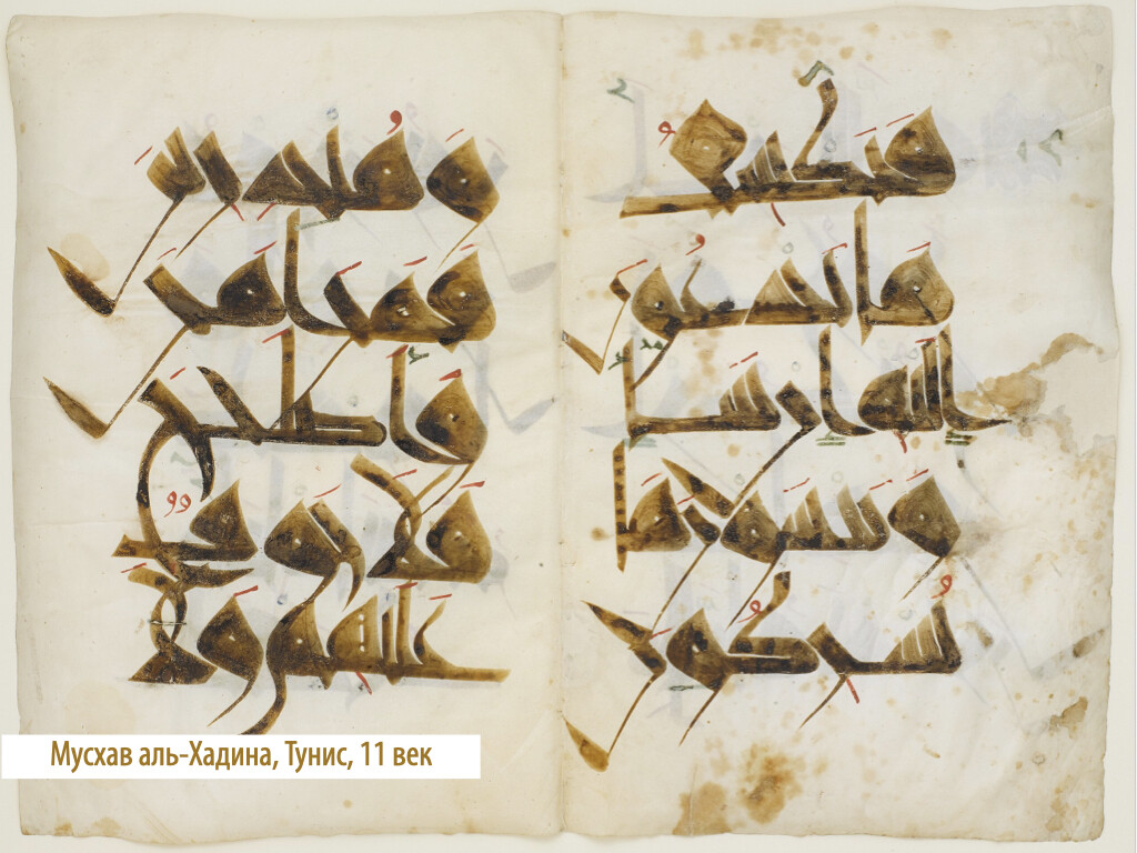 Самым известным памятником этого стиля является Коран «Мусхав аль-Хадина», или «Коран няни» (11 век), который был заказан для Великой мечети няней принца правящей династии Зиридов. На каждой странице Корана располагается всего 5 строк, поэтому книга была разделена на 60 частей, содержащих почти три тысячи листов пергамента. Долгие годы этот Коран хранился в библиотеке Великой кайруанской мечети, но в прошлом веке был передан в музей Бардо, так как сильно пострадал от неправильного хранения — позолота потускнела, а украшения и переплет разрушились от времени.