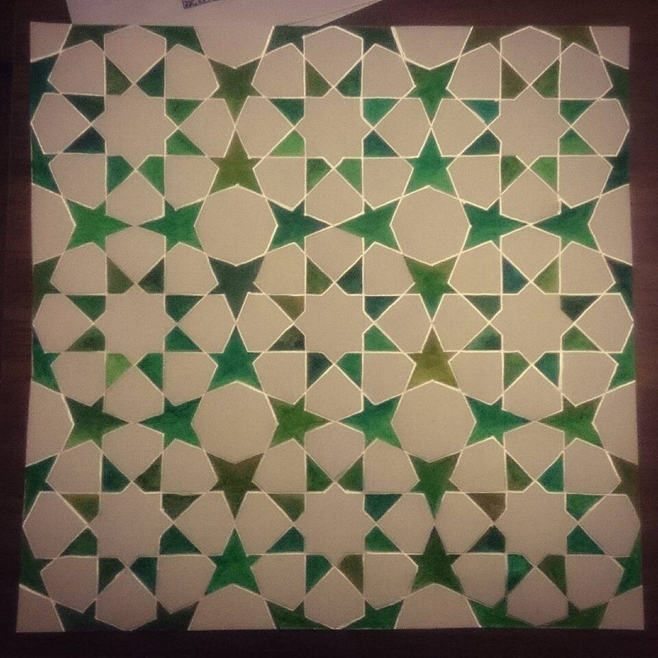Мы начнем с простой восьмиконечной звезды, украшающей стены старой мечети VII века в Тунисе (Великая мечеть Кайруана), отработаем точность построения и базовые принципы раскрашивания акриловыми красками. Цветовую гамму вы сможете выбрать сами, ориентируясь на предложенные образцы и рекомендации преподавателя.